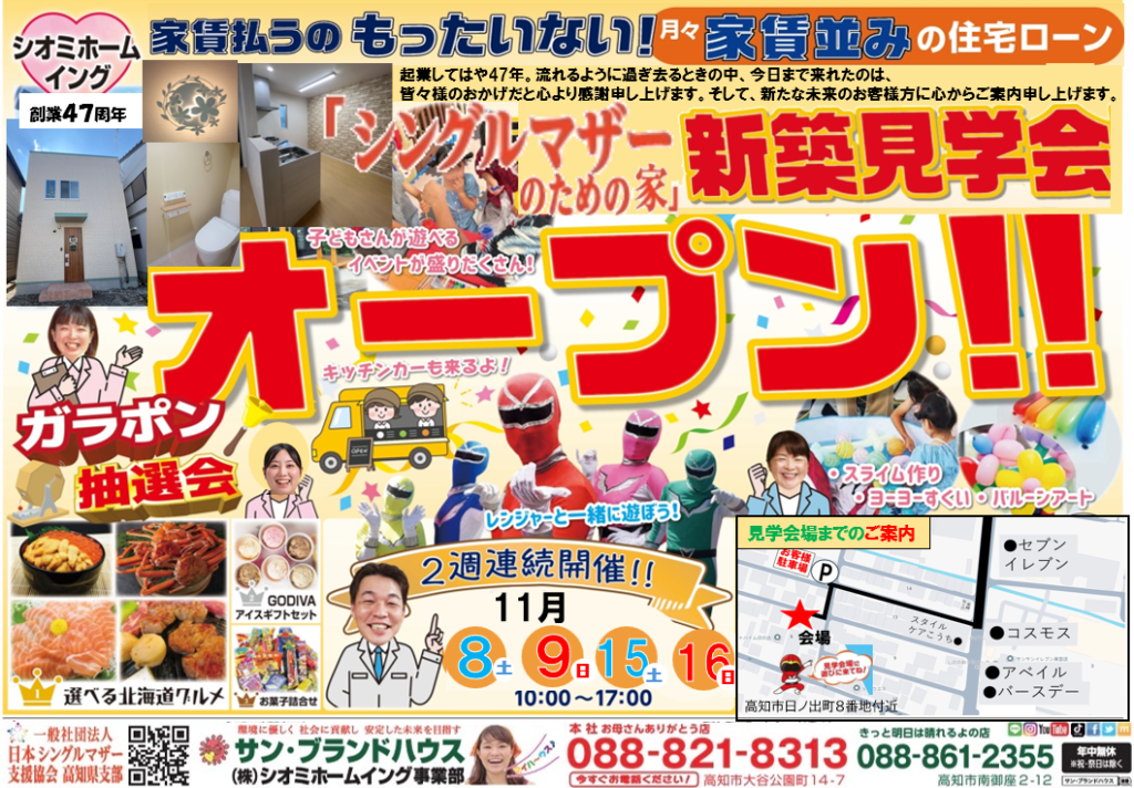 今回の会場は、高知市の日ノ出町で小学校にも近く、静かなところで、子育てもしやすい場所での新築見学会です!