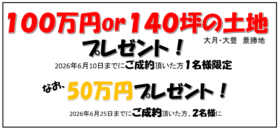 ※100万円or140坪の土地、50万円プレゼントについては、ご契約時に担当より、ご説明いたします。
